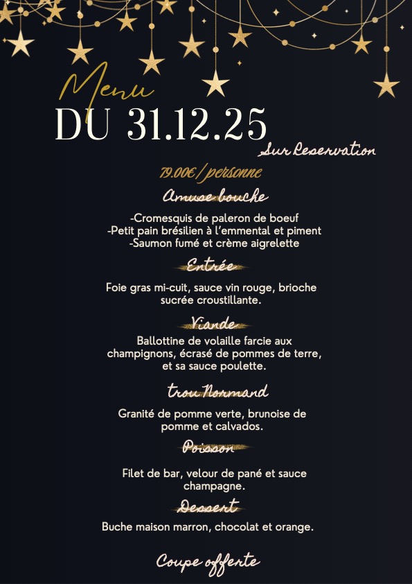 Pour célébrer la Saint-Sylvestre, notre chef vous propose un menu d’exception, imaginé spécialement pour sublimer les produits de saison et faire de votre dîner un moment inoubliable.
